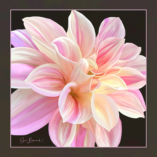 A vibrant, close-up depiction of a large Dahlia showcases delicate petals in shades of pink, cream, and soft yellow. The composition highlights the intricate details and subtle colour gradients of the bloom against a dark background. Digital painting of one of my own photographs.